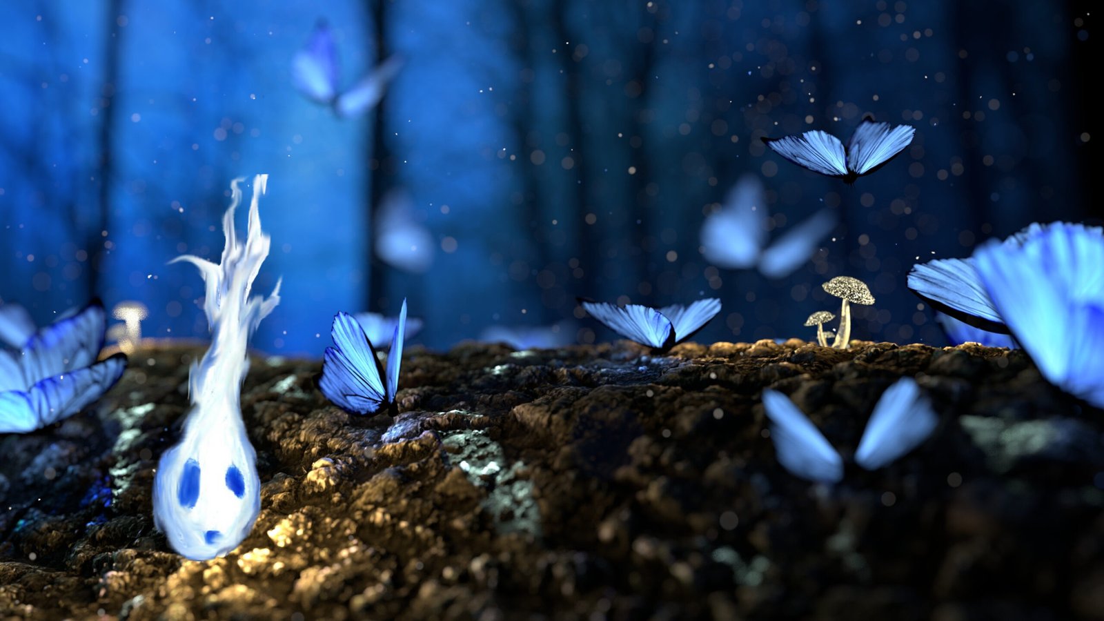 Whimsy came about from a variety of inspirations and influences. The face is kind of similar to the forest spirits from Princess Mononoke, its color is from old depictions of their light or flame being blue like in brave and their playful personality from the sprites similar to ones in other Hayao Miyazaki films. The flame-like yet plant-like look gives them an organic air representing the natural world or nature.